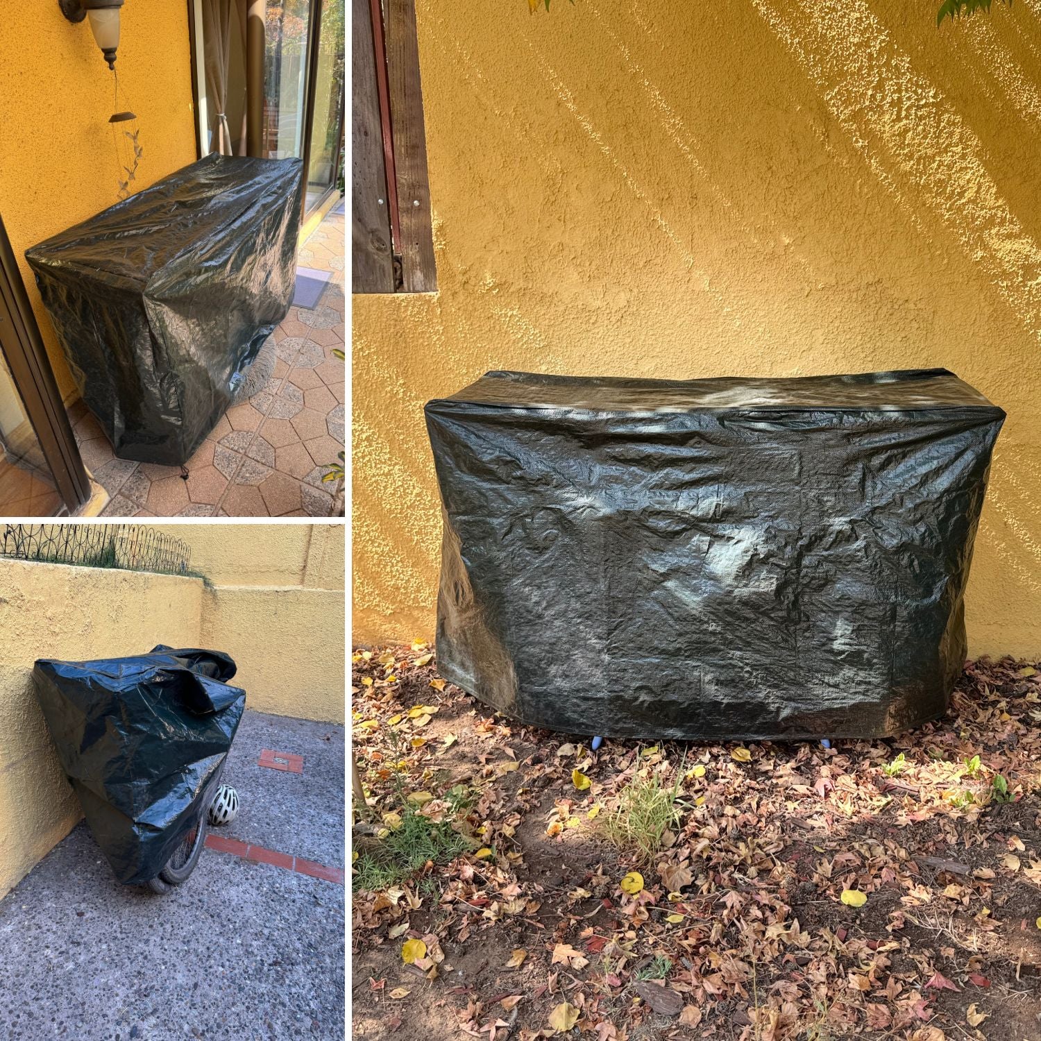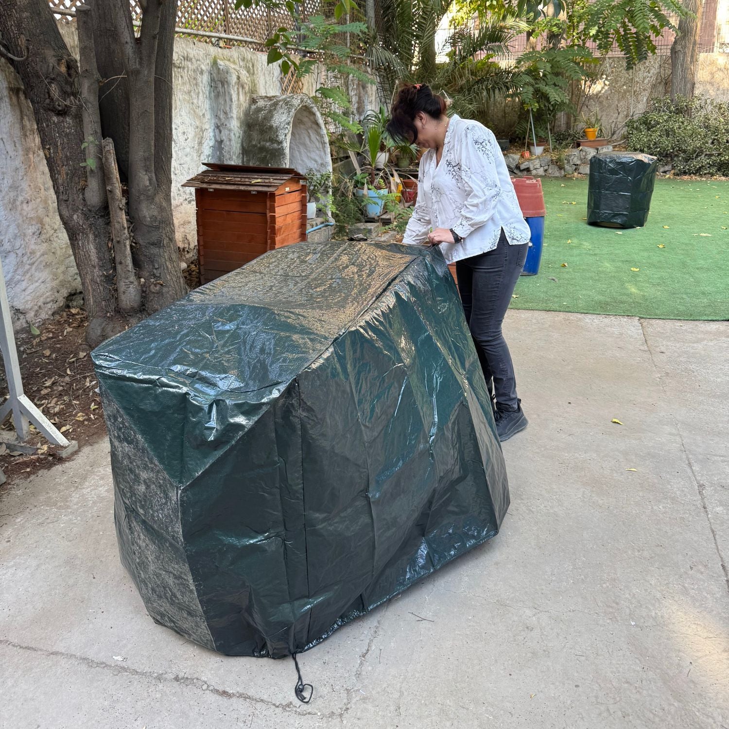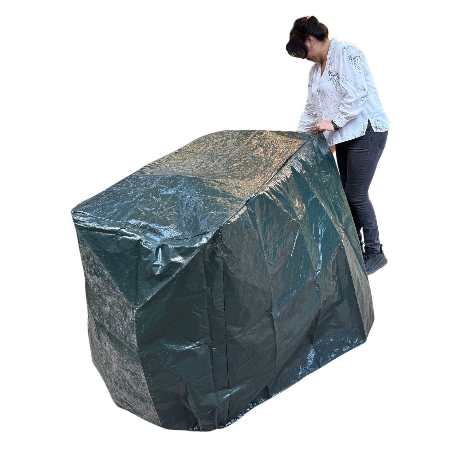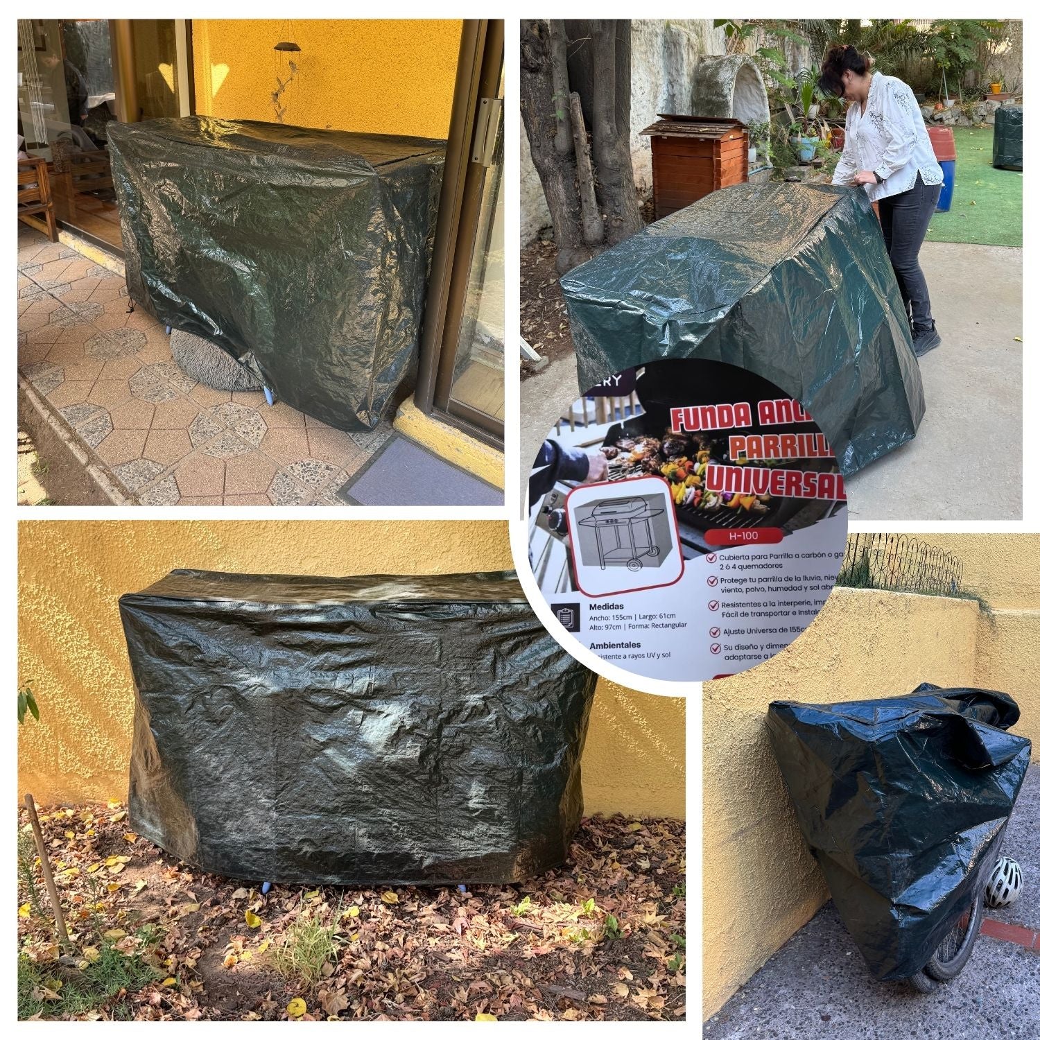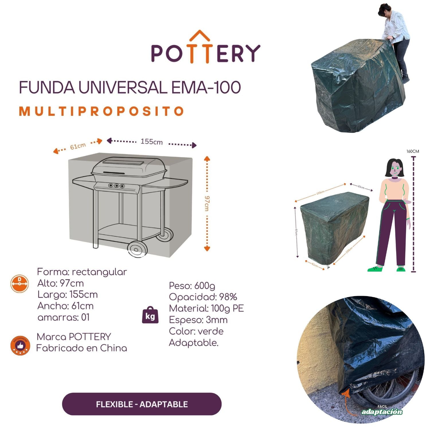 Funda Universal Multiproposito Ema100 tiene la forma de un rectangulo, de color verde, está hecha para proteger multiples productos o lugares tales como parrilla, motos, bicicletas, muebles de terrazas, sillones o cualquier cosa que de la intemperie. Fabricada en polimero 110g PE, es un material resistente para soportar los exposición prolongada al son sin degradarse. Resiste lluvia, agua, polvo, viento y a los rayos UV , protegiendo tus artefactos del ambiente hostil, como viento fuerte, lluvia, tormentas, sol intenso, insectos, nieve, etc.