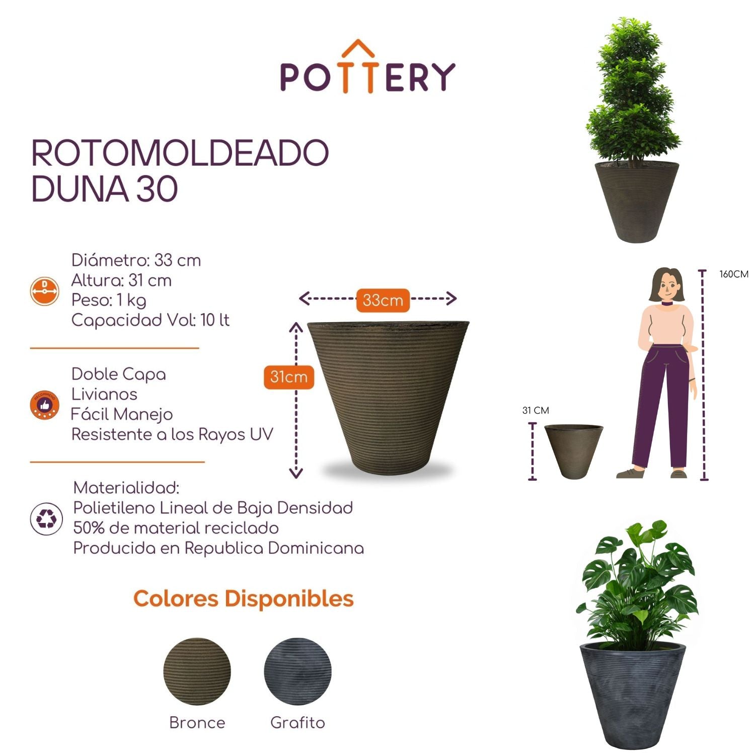 Aporta un estilo elegante y moderno a tu jardín con nuestra Maceta Grande Duna de 30cm de altura. Su diseño y acabado tiene un color bronce que se adapta a todo tipo de plantas, ideal para tu patio, terraza o balcón. Su forma y color son la combinación perfecta para un jardín, tiene una pared interior de profundidad total para un aislamiento óptimo de las raíces.