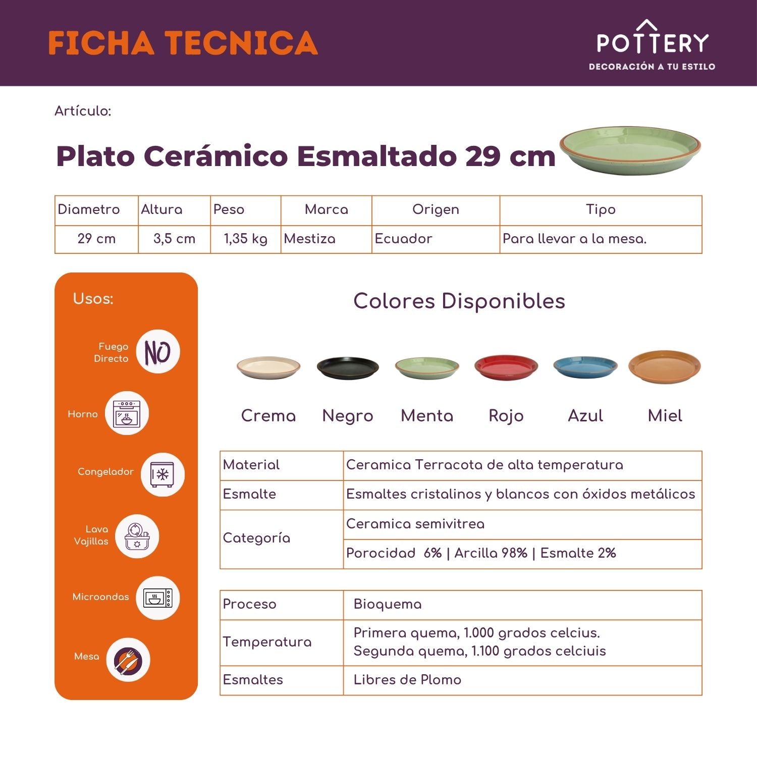 Platos de arcilla esmaltada, tamaño 29 cm en disponibles en 6 colores, Verde Menta, Azul Miel, Negro Ébano, Crema Miel, Miel y Rojo Fuego. Aptos para microondas, horno, congelador y lavavajillas. Ideales para servir el plato principal. Tu diseño, color y materialidad llevaran encanto y belleza a su mesa. Proporcionado momentos inolvidables.
